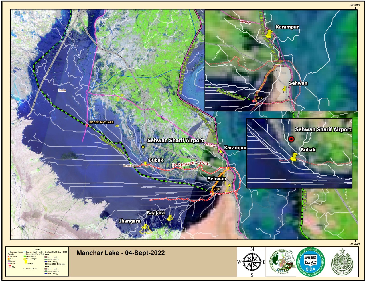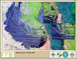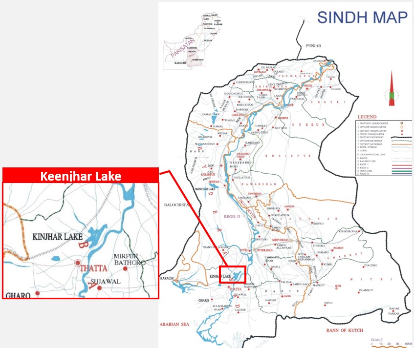 INTRODUCTION : Manchar Lake is the largest natural freshwater lake in Pakistan and one of the largest in South Asia1. It is located west of the Indus River, in Jamshoro District and Dadu District, Sindh - 18 km away from Sehwan. The lake collects water from numerous small streams in the Kirthar Mountains and then empties into the Indus River. The lake’s surface area fluctuates with the seasons, from as little as 36 km² to as much as 500 km² during monsoon rains.
