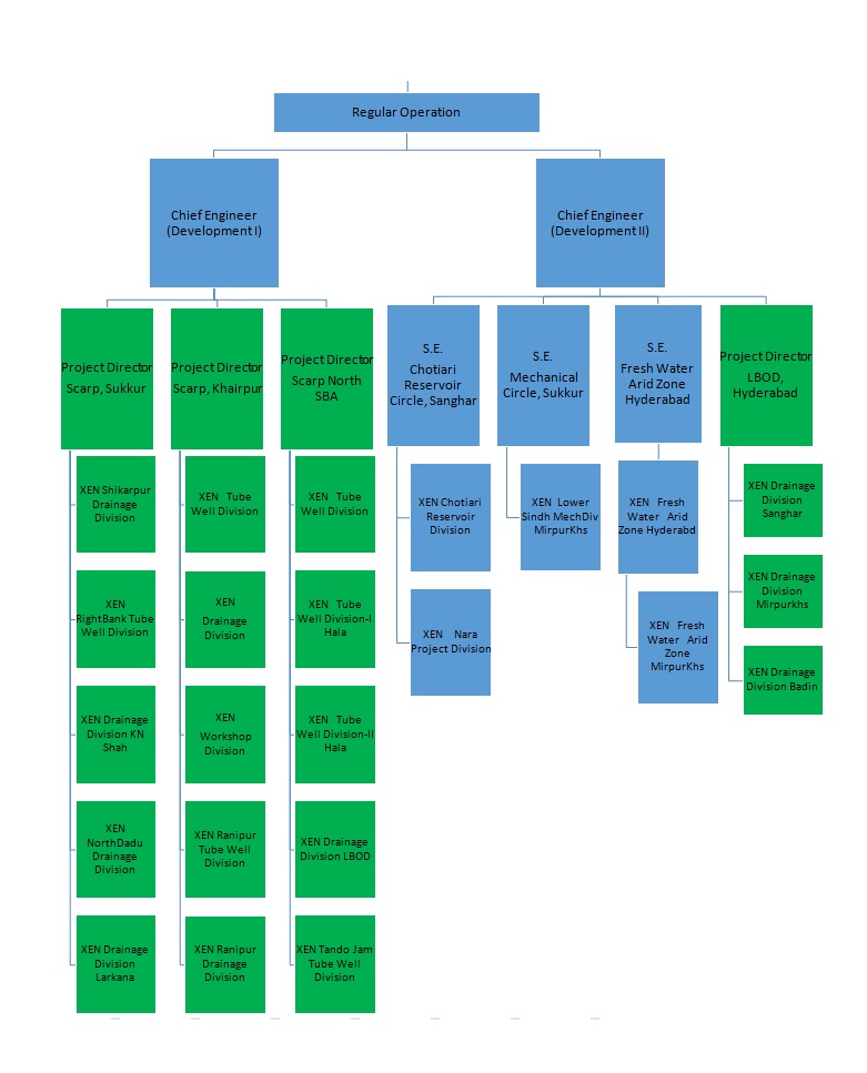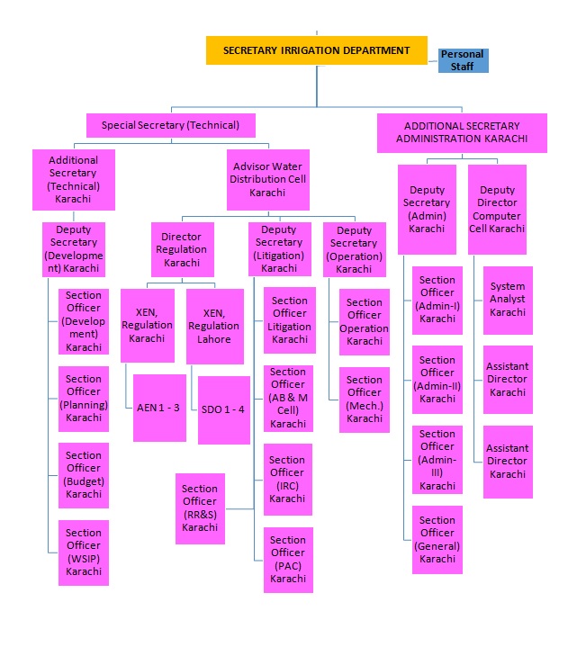 Irrigation Department was Split from Irrigation and Power Department, internal structure of Irrigation department have gone through many different phases of improvements.Below are attached Sections at Head Office working together as building blocks of Irrigation, having defined powers & functions: