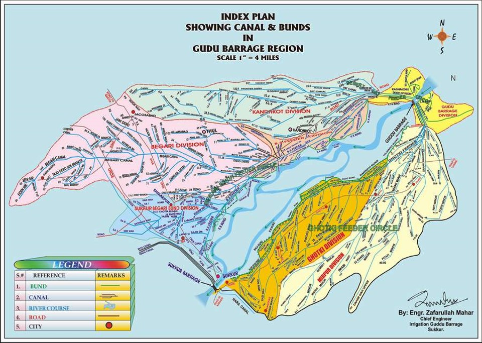 The Barrage is situated 10 miles north-west of Kashmore and about 100 miles upstream of Sukkur Barrage on River Indus, almost at the northern boundary of Sindh Province. The Barrage has been designed for providing assured water supply and improvement and extension of Irrigation facilities of Sindh and Baluchistan areas, which were being irrigated by inundation canals, the supplies of which were depending on uncertain fluctuating water levels of River Indus. The construction of head works was completed in the year 1962. The whole area commanded by the Guddu Barrage designed non-perennial.
